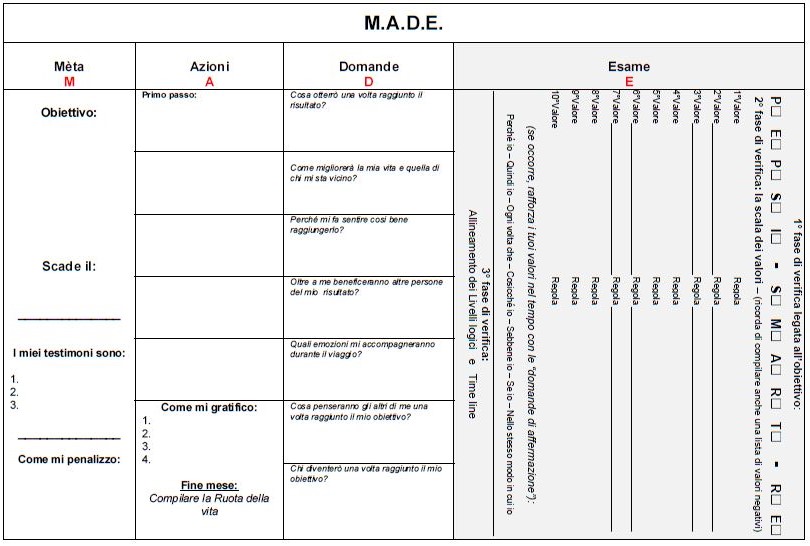 Inizia con il disegnare 4 caselle, ogni casella è specifica e descrive la mèta (M), le Azioni da fare (A), le domande specifiche (D) e la più importante, la casella di verifica (E), come riportato nella foto sopra.
