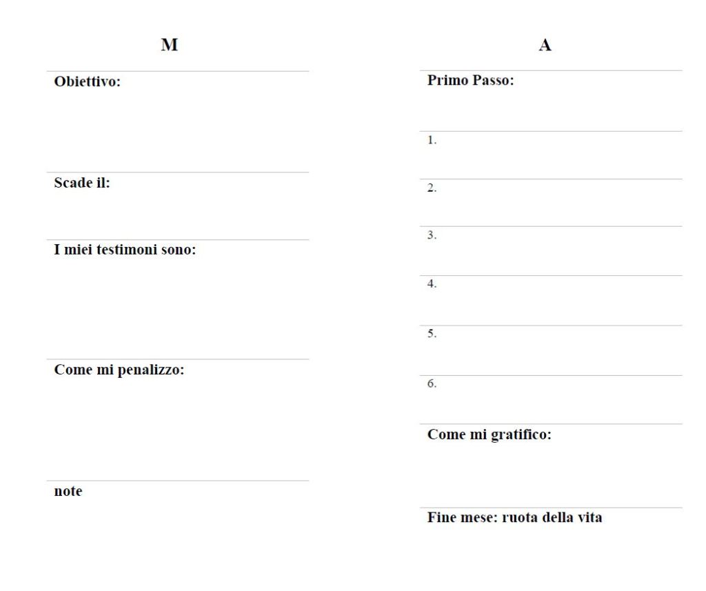 Descrivi nel riquadro M (Mèta) il tuo obiettivo, cerca di essere molto specifico, metti la scadenza, chi saranno i tuoi testimoni (far partecipi gli altri significa spronarci maggiormente al risultato), e descrivi come ti penalizzerai se non raggiungerai il tuo obiettivo (ad esempio un assegno all’associazione Cacciatori se sei un fervente animalista).